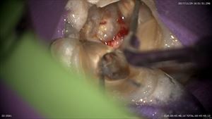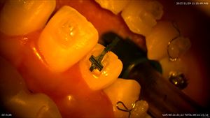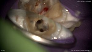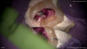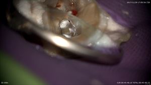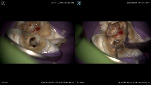 それが嫌なので当院ではしっかり診断(歯科ドック)を行い重症度や考えられる治療オプションなどありとあらゆる可能性を考え患者さまと共有します。歯科ドックからこの患者さまには実は親知らずの移植の選択肢もありました。しかし私は口腔外科を専門としておりません。なので先日私の信頼する口腔外科医の診察を受けて頂きました。すると「難しい」と診断を受けました。患者さまは治療の選択肢を納得され今日のマイクロスコープ下保存的根管治療を選択されたのです。この工程がいかに大切かわかると思います。そして当院初診から2ヶ月経って当院は歯を削ります。では見てみましょう。