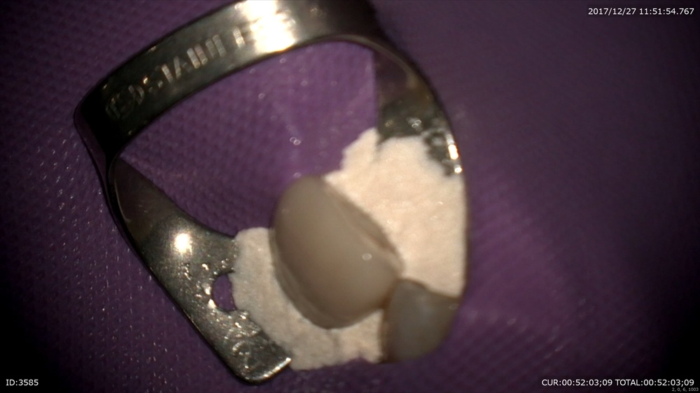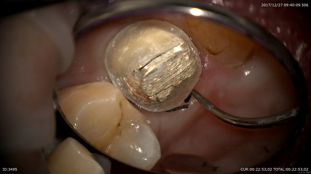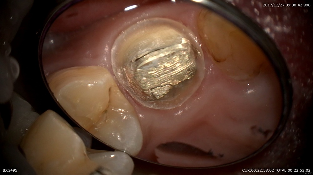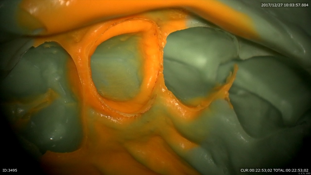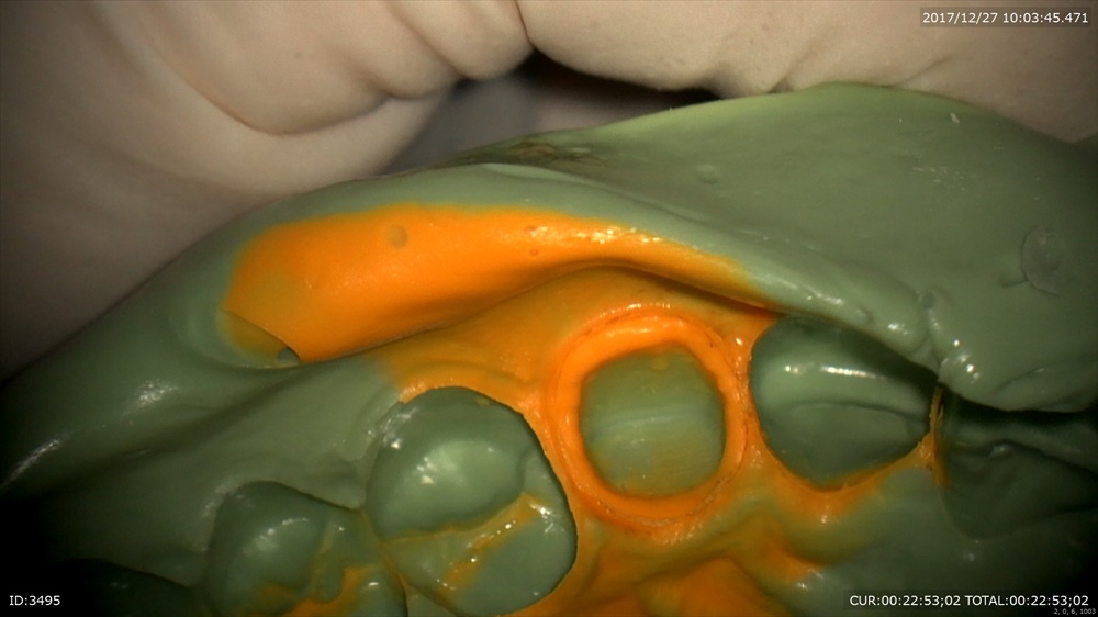 精密な型取り。左上の糸きり歯は大切な歯です。ハイブリットクラウンの型取り。