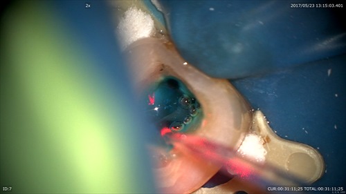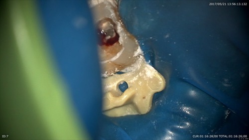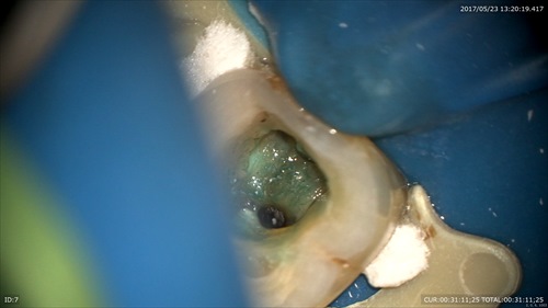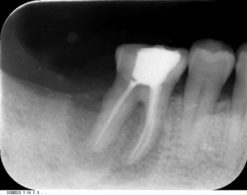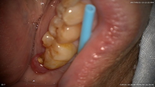 こんな状態でした。一番奥に膿の塊が見えます。歯周病と混在している病巣でぼくらの業界では治すのは難しいとされている1つの状態です。