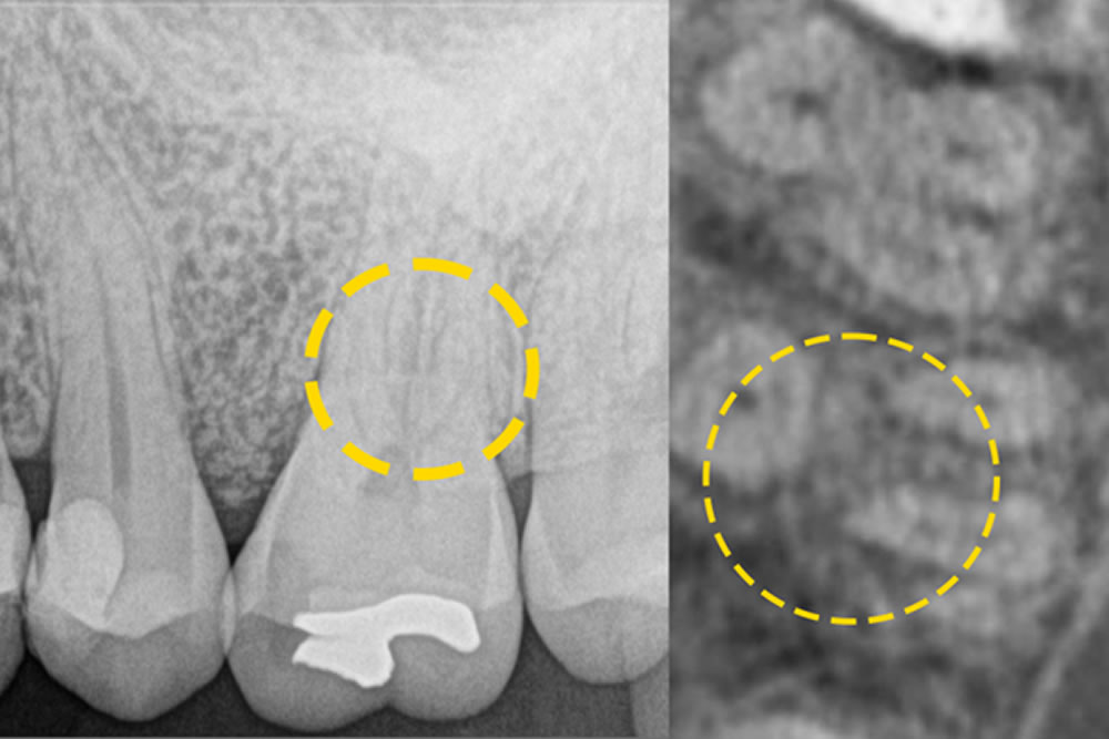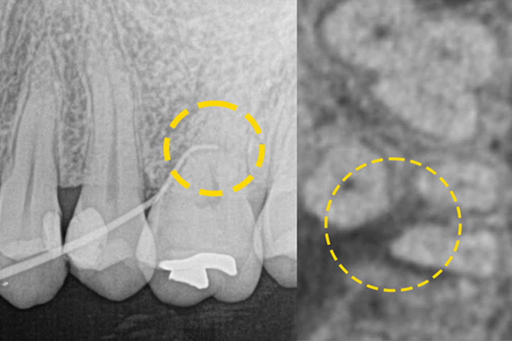 こちらの患者さまは、左上の第一大臼歯の近心部に「垂直性骨欠損」が認められ、歯周病の進行により歯を支える骨が深く失われていました。また、同じ歯の根の分かれ目(分岐部)にも炎症が広がっており、「根分岐部病変」という状態でした。これは、歯の根が分かれている部分まで歯周病が進行し、プローブが分岐部の中ほどまで届くような中等度の病変を意味します。