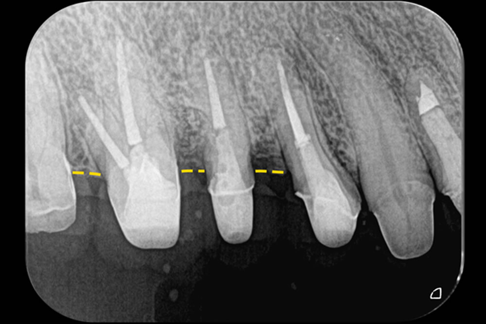 治療では、Er:YAGレーザー(エルビウムヤグレーザー)を用いて感染した組織を除去(デブライドメント)し、骨の再生を促す前処理(デコルチケーション)も同機器で行いました。治療から2年半が経過した現在も、歯と歯ぐきの状態は非常に安定しており、良好な経過をたどっています。