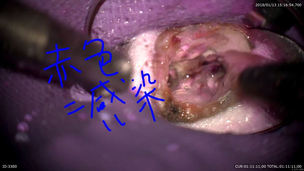 中は 感染だらけ。下の7番の近心。直視で虫歯除去、マージンを研磨