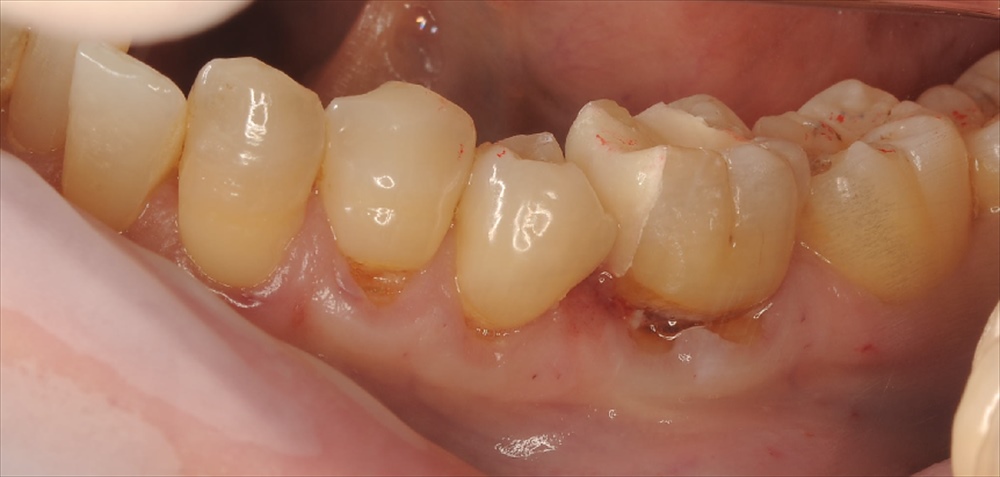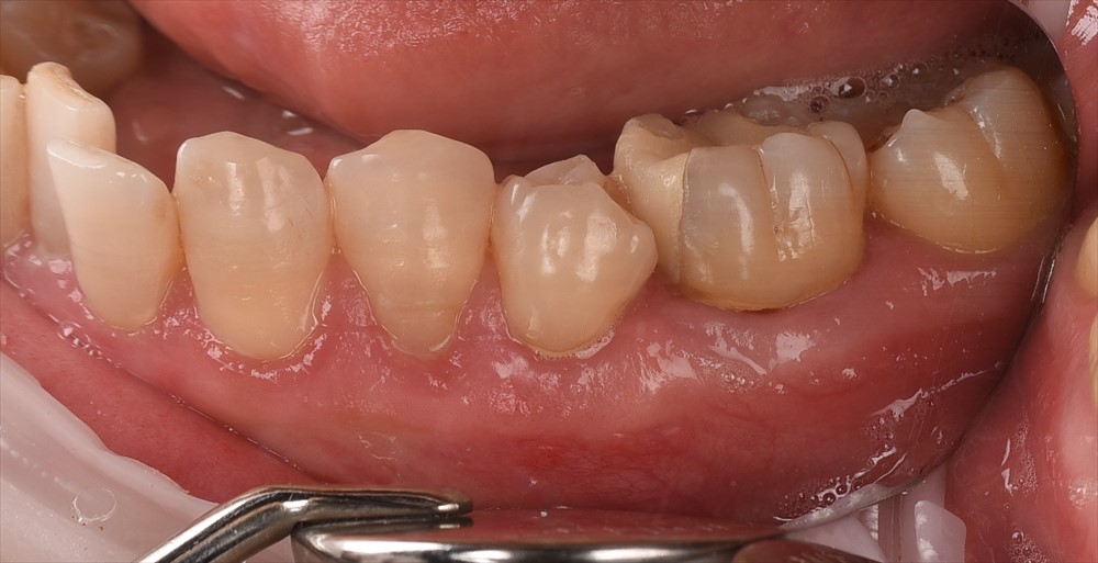 この様に左下の象牙質が露出し、何をしてもしみるとの事で①年前に来院されました。