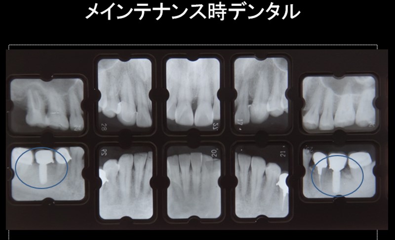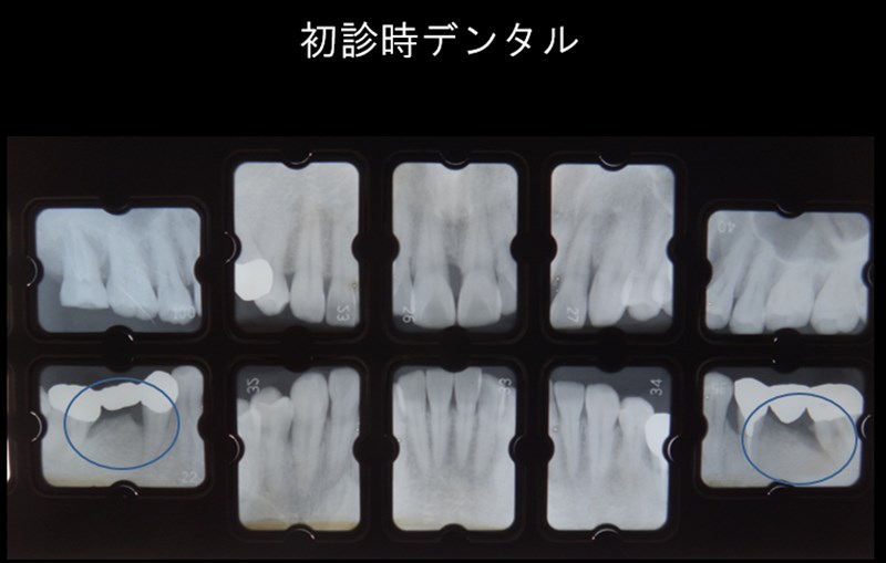 全顎的に中等度~重度の歯周病でしたが特にこの青丸の部分に注目すると著しい骨吸収でした。