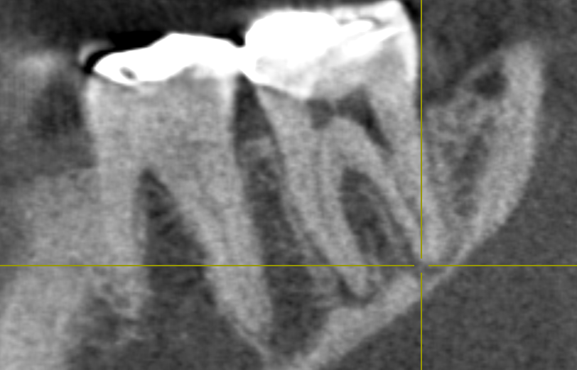 CTとデンタルをみると髄床から何か管か破折線か見えます。なんだろう。これが分岐部病変の原因ではないかと思います。歯科ドックをしたからここまでわかりました。