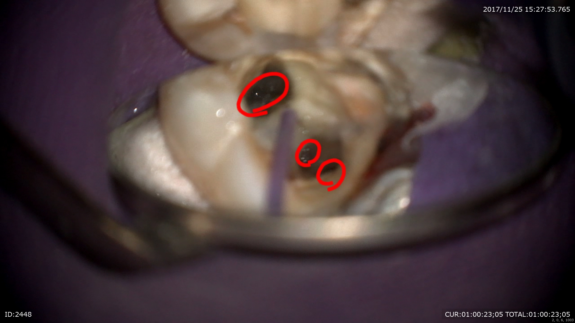 非常に珍しいケース。近心の根管の中に分岐部があり根管がご覧の様に縦に並んでいました。根管の形態はご覧の様に様々。だから時間と精密さが求められます。