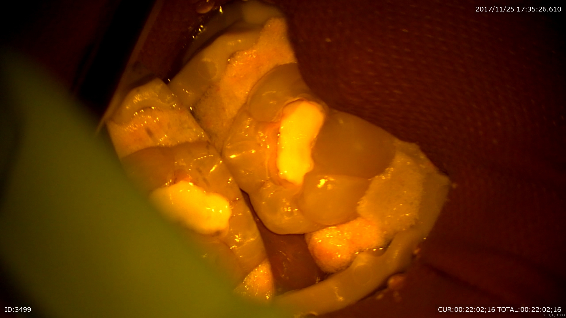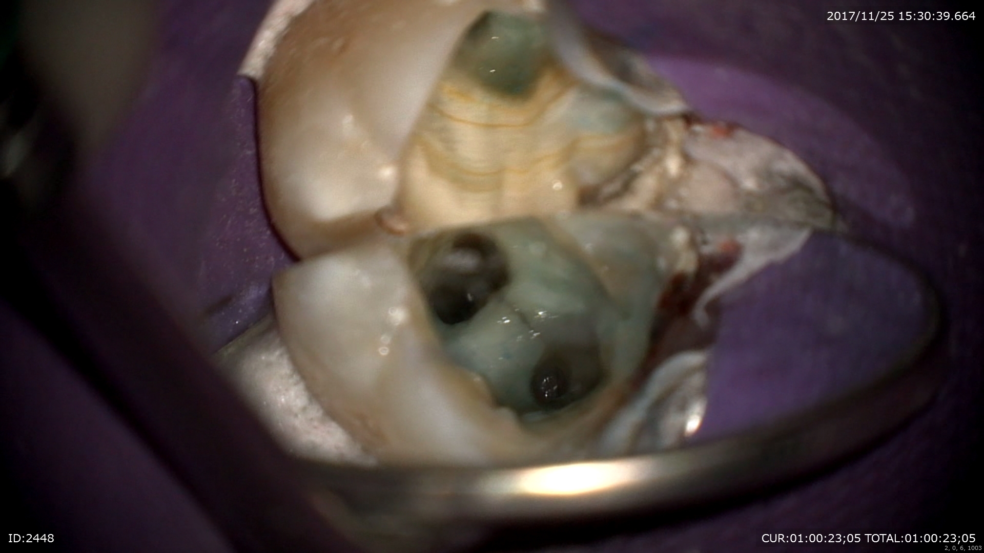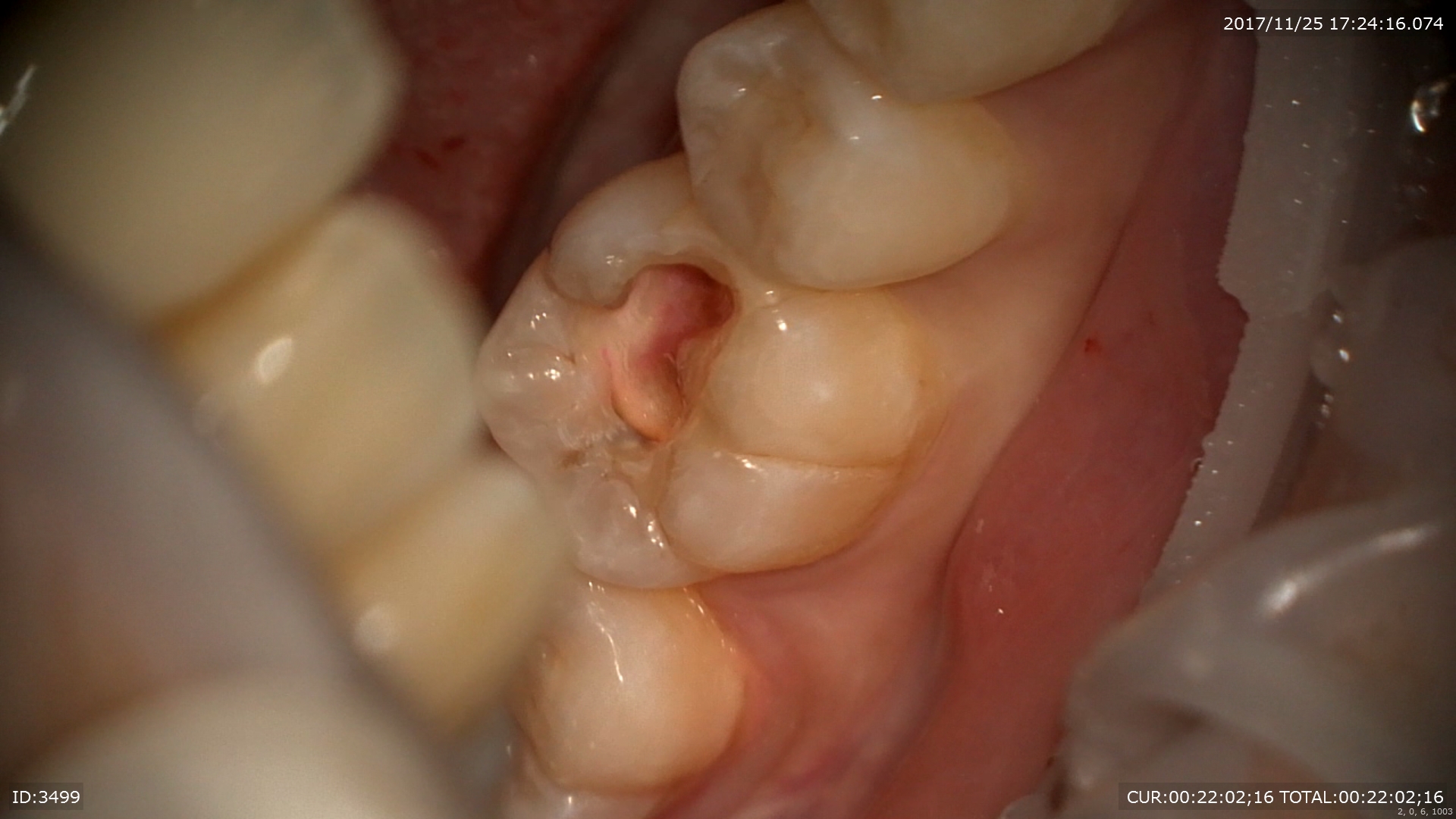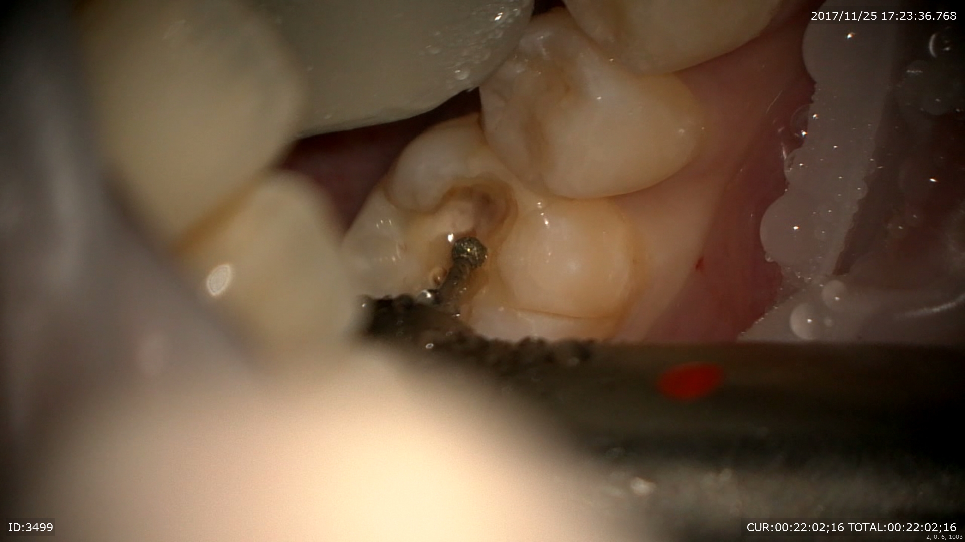 ん?歯髄から結石が!!これもマイクロエキスカで丁寧に取ります。