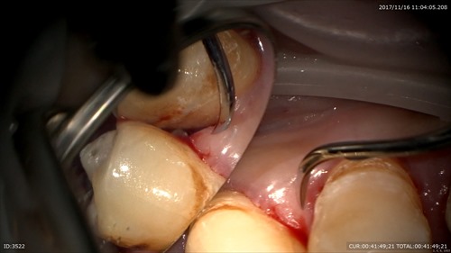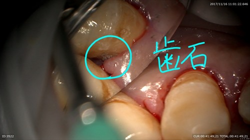 マイクロスクープでくっきり見えます。当院では衛生士が歯茎よりも上のデブライドメントを私が歯茎よりも下の治療を行いチームで歯周病治療を行います。患者さまも今までは衛生士さんのみに歯石をとって頂いていたと言っていました。この歯周病のデブライドメントはそんなに簡単な仕事ではありません。歯周組織の解剖とセメント質の厚み、年齢、超音波での1回あたり削れる量。手用スケーラーの一回で削れる量。などありとあらゆる条件を計算し取り組む必要があり、やりすぎると象牙質が削れたりそのせいでしみます。だから私が難しい所はすべて歯周病専門の私が担当しています。
