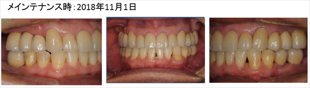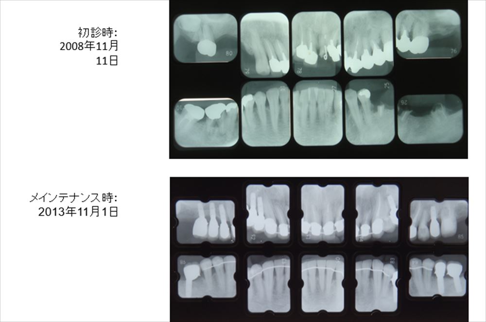 この様にしっかりとした治療戦略の元、歯周組織再生療法、インプラント、セルフライゲーションによる弱い力による歯周矯正治療を行う事で長期的に問題がおきない環境が獲得できています。