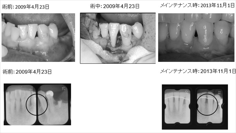 この症例は歯周組織再生療法を行ってから約10年問題がない症例です。