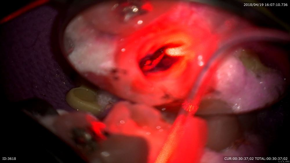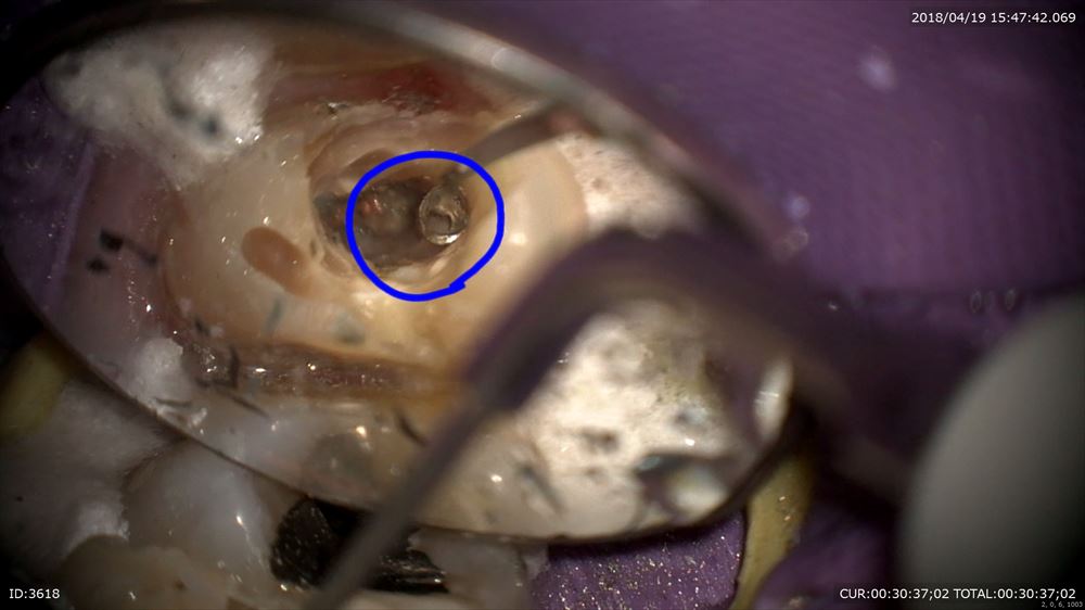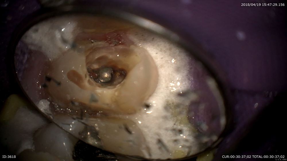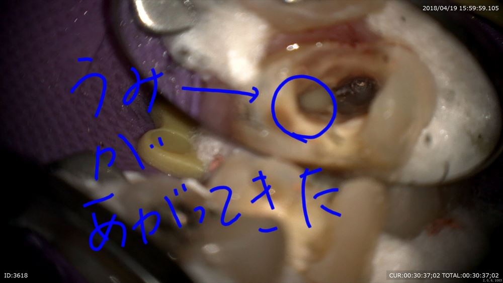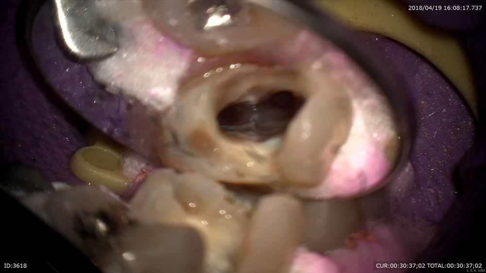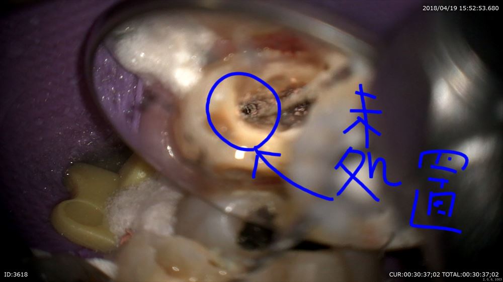 口蓋根が見つけられておらず根尖病変がありました。原因がはっきりCTでわかっていますので迷うことなく口蓋根を見つけにマイクロスコープ!