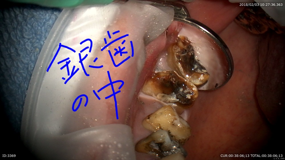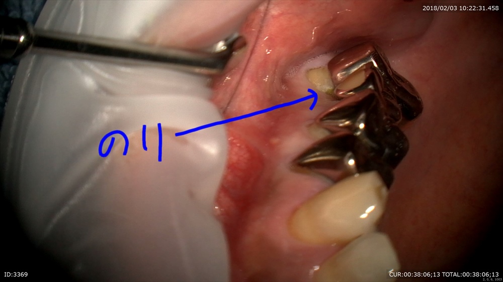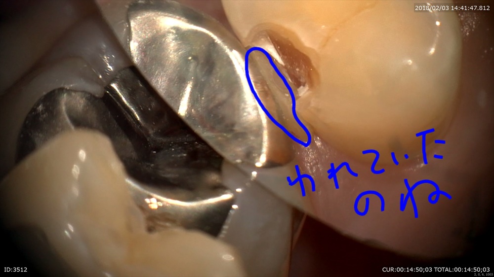 歯周病治療が終わり次のステップ。銀歯のブリッジが入っています。一見なにもない。症状もありません。歯科ドックでこの下に大きな虫歯が発見されました。本当でしょうか?のりが挟まっている。ということはここに隙間がある。=ここから細菌の進入が!!