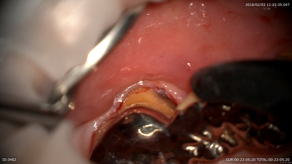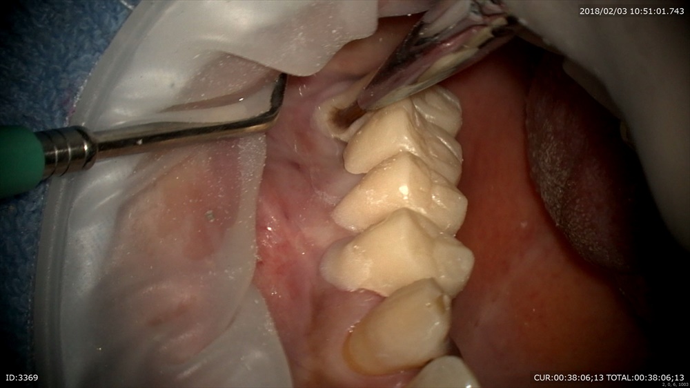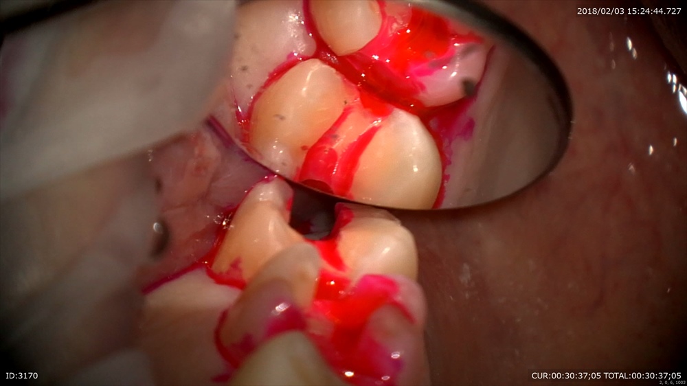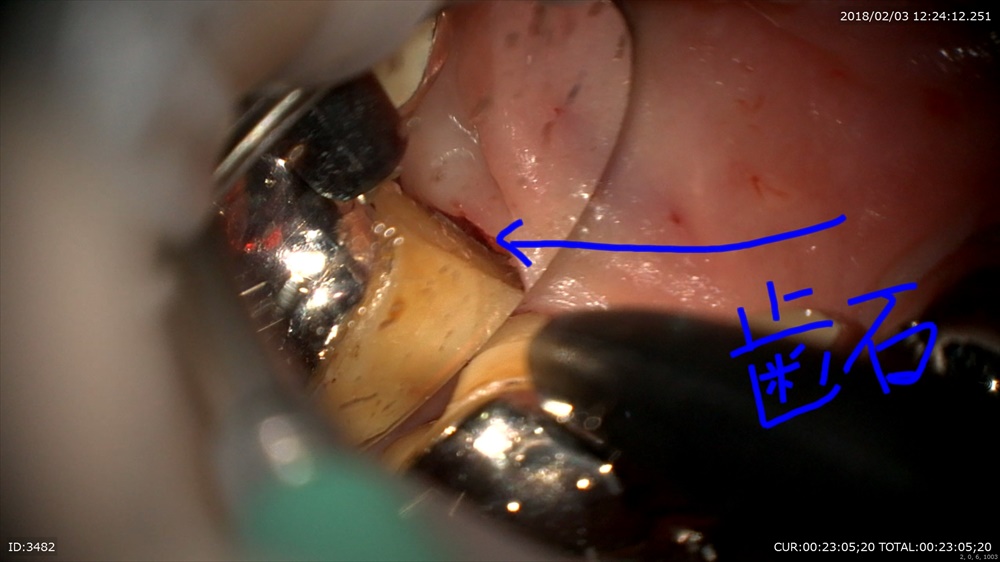 マイクロスコープで歯茎の内部を歯根表面を傷つけずに除菌します。