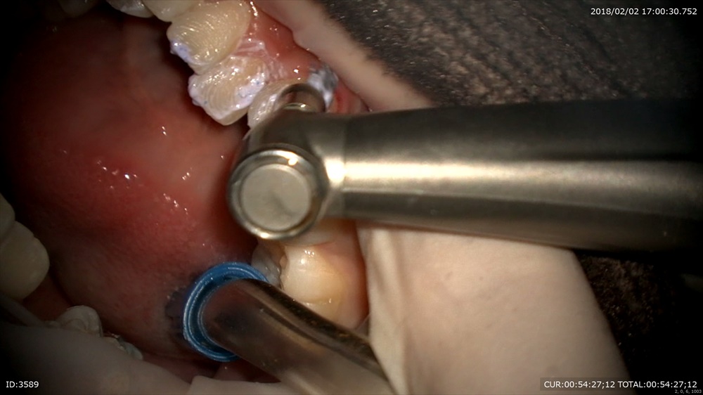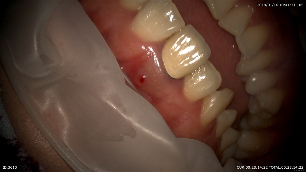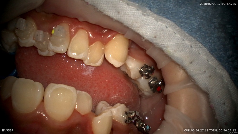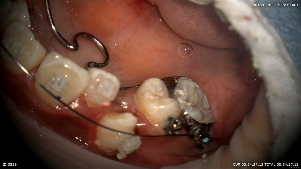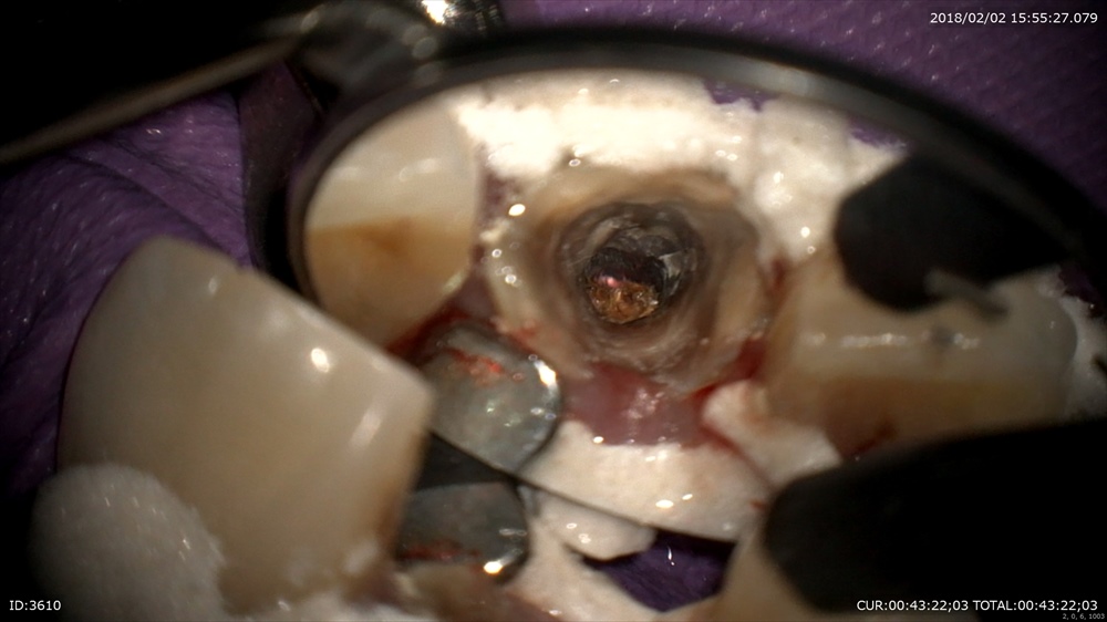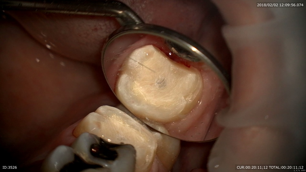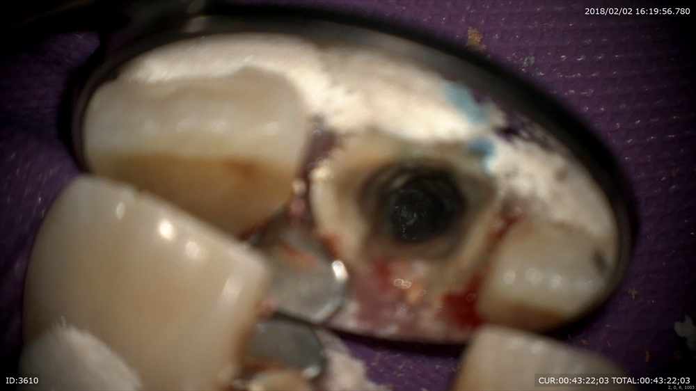 次は精密根管治療の後の処置。MTAで根管充填し細菌感染を防ぐ為即日ファイバーコアを築造。
