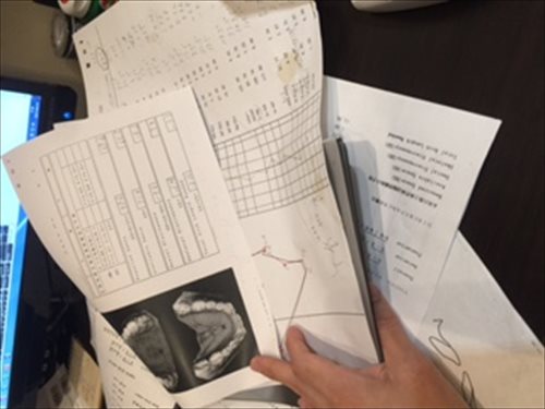こんにちは。院長の武川です。今日は気温があがりそうですね!水分をまめにとりたいとおもいます。さて昨日の夜は先日矯正相談でいらした方の診査・診断を行っていました。これが一番時間がかかります。でも最重要です。昨日は相談の方が2名。当院が3件目という方もおられました。「先生によって抜歯する部位、本数が違う」と迷われておりました。矯正治療はその診断により抜歯又は非抜歯そして抜歯部位も変化いたします。そしてその矯正システムによっても変化します。例えるとゴルフと少し似ていて目指すものは一緒ですがドライバーやUTなどカップにいれる方法はそれぞれの先生によって少し違うとお話しました。私は医科歯科大の矯正科で最初学びその後日大矯正科の先生に弟子入りして矯正を学びました。その2つの大学でさえ分析項目の数値や項目に差があります。どっちが良いということはありません。ただ私はどっちの良いところも取り入れ分析しますので下記の様に書類だらけになります。笑